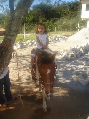 As meninas montadas no pônei da fazenda. A Ana Luisa chegou até a passear nele.