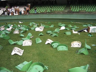 Também duvido de prisões e processos para os baderneiros e terroristas que invadiram o campo. A foto que coloco abaixo, das cadeiras do estádio jogadas no campo (Lancenet), dá bem a medida da zorra que foi o final da partida.