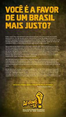 Aproveito para reproduzir cartaz (acima) que seria publicado no jornal O Globo defendendo o instituto das cotas. Entretanto, o jornal carioca cobrou um preço absurdo afirmando ser “opinião”. Na prática, uma censura branca.