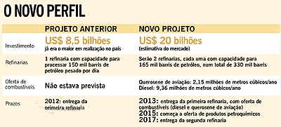 Com as alterações no projeto o início da produção passa de 2012 para 2013, estando o término das obras e a produção a toda capacidade previstos para o ano de 2017. O investimento estimado passa de US$ 8,5 bilhões para US$ 20 bilhões e o número de empregos previsto, ainda antes da revisão no planejamento, era de duzentos mil na construção e mais cinquenta mil na operação propriamente dita. Não custa lembrar que além das duas refinarias propriamente ditas se instalarão na região indústrias transformadoras, a fim de utilizar a nafta (foto acima) como insumo para a produção de petroquímicos, em especial plásticos. Ou seja, o efeito indutor das duas refinarias da Petrobras na economia do Estado é bastante impactante.