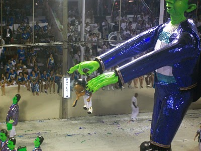 Em suma, a bateria foi uma lástima. A ponto de Mestre Átila fazer duas “paradinhas” seguidas em frente ao ponto da pista onde eu estava para ver se conseguia acertar o ritmo. Para quem não conhece, as paradinhas são recursos que visam abrilhantar o desfile de uma escola, mas também podem ser utilizadas para corrigir erros da bateria – algo como “parar para começar de novo”.