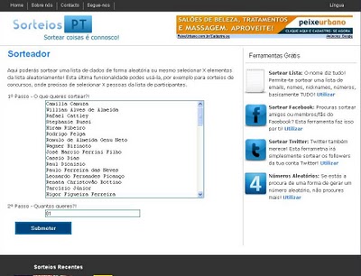 Sobre a mecânica do sorteio: utilizei-me da ferramenta web “Sorteios.PT”, que é simples, rápida e que não permite direcionamentos. Como verão nas telas capturadas abaixo, na primeira tela colocam-se os participantes e quantos prêmios serão sorteados e, na tela seguinte, ele te dá o resultado. É muito interessante.