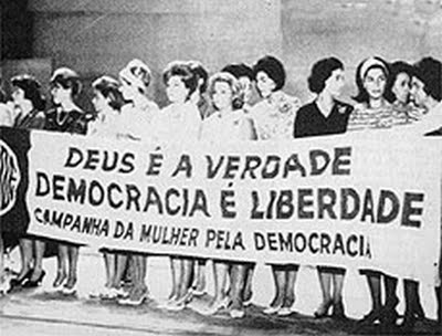 A Revolução Cubana, ocorrida em 1959, que começara nacionalista e a partir de 1961 adquirira tom socialista, era um exemplo próximo ao Brasil que os EUA faziam de tudo para evitar. Então, no pré-1964, o anticomunismo ganhava tons mais fortes. Inseriam-se também novos elementos favoráveis à causa conservadora: o medo de que o comunismo desagregaria a família brasileira, que também fosse contrário ao catolicismo, à moral e os bons costumes brasileiros [N.doE.: outra falácia].