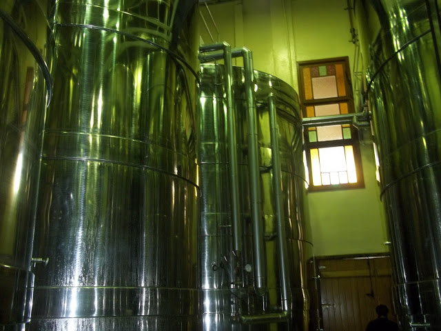 A visita começa pelos fermentadores das uvas. Ao contrário da cerveja, o processo de produção do vinho é mais simples: basicamente se resume a esmagar as uvas e deixá-las fermentar. Depois, de acordo com cada uva, maturar um tempo e em seguida engarrafar.