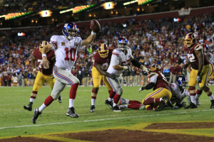 LANDOVER, MD – SEPTEMBER 25: Quarterback Eli Manning #10 of the New York Giants scores a fourth quarter touchdown against the Washington Redskins at FedExField on September 25, 2014 in Landover, Maryland. Rob Carr/Getty Images/AFP