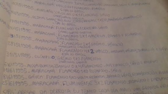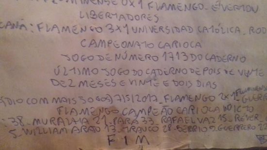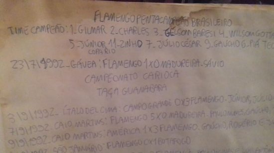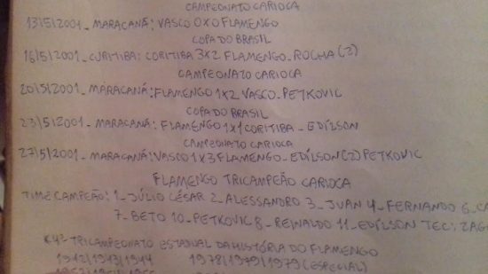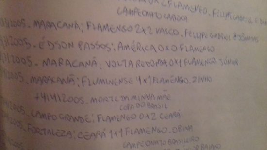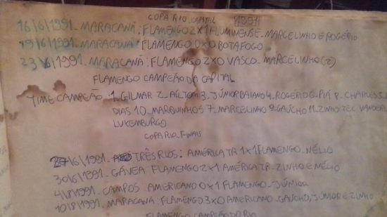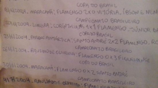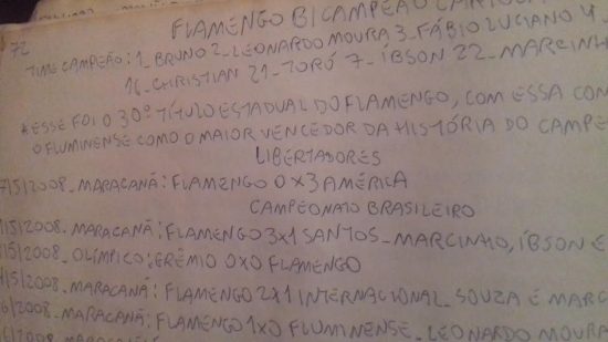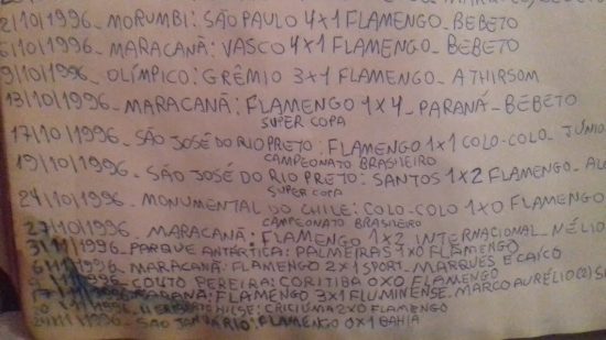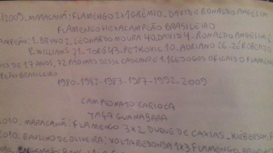 Tem tudo de relevante da história do Flamengo nos últimos 26 anos ali, suas maiores vitórias e derrotas escritas em tempo real por minha caligrafia do momento, o nome de todos os seus grandes jogadores como autores de gols ou em escalações de times campeões: Júnior, Gaúcho, Zinho, Romário, Bebeto, Renato, Marcelinho, Djalminha, Paulo Nunes, Edmundo, Sávio, Edilson, Petkovic, Ronaldinho Gaúcho, Adriano, Diego, Guerrero e pude retratar o centenário do clube lhe homenageando…