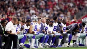 O presidente Trump pediu que os donos de equipes demitissem os jogadores que se recusassem a ouvir de pé o hino nacional e a resposta foi imediata com a maioria dos jogadores ouvindo ajoelhados ou com braços entrelaçados o hino na rodada seguinte do futebol americano.