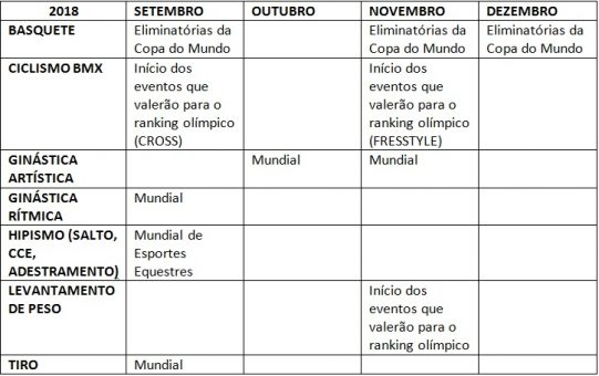 Por fim, para resumir tudo, fiz um cronograma semelhante ao calendário de eventos dos jogos, mas para os eventos pré-olímpicos, citando quais serão realizados em cada mês. Como muitas datas ainda não foram definidas, fiz o cronograma do restante de 2018 apenas; vale lembra que já estamos classificados em: futebol feminino e vela (49erFX, Finn e Nacra 17), e já começou o período de eventos que valerão para o ranking olímpico no ciclismo pista.