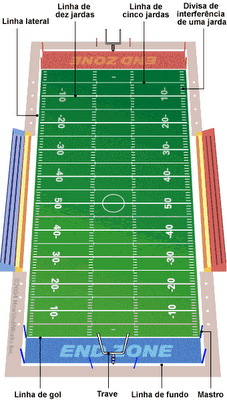 O campo de jogo do futebol americano possui 120 jardas (109,73 m) de comprimento por 53 ⅓ jardas (48,76 m) de largura. A “área útil” do campo possui 100 jardas de comprimento e em cada extremidade possui mais 10 jardas que são chamadas de End Zone.