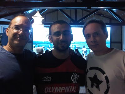 O amigo Lédio Carmona, comentarista do Sportv, junto ao narrador Eduardo Moreno. Por uma destas incríveis coincidências, viemos no mesmo vôo e, depois, nos encontramos no excelente restaurante Iemanjá – onde a foto foi tirada.