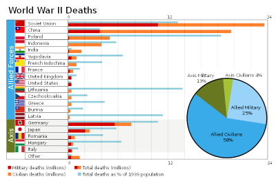 A URSS foi o país que mais perdeu vidas na Segunda Guerra Mundial. Se na Primeira Guerra Mundial, a Rússia perdera um efetivo equivalente a 30% de seu efetivo militar, na Segunda Guerra Mundial algo em torno de 24 milhões de soviéticos perderam suas vidas nos esforços de guerra. (vejam os gráficos comparativos entre as duas grandes guerras)