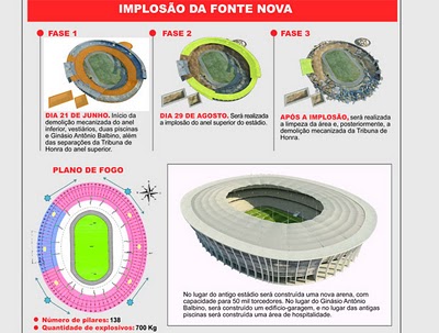 Amanhã inicia-se a implosão do Estádio da Fonte Nova, na Bahia, com vistas à construção de uma nova Arena visando à Copa do Mundo de 2014.