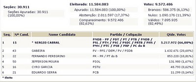 Para governador, Sérgio Cabral teve uma votação até um pouco superior à esperada. Creditaria a este movimento um certo “voto útil” de eleitores influenciados pelas pesquisas ou que optaram por não anular o voto.