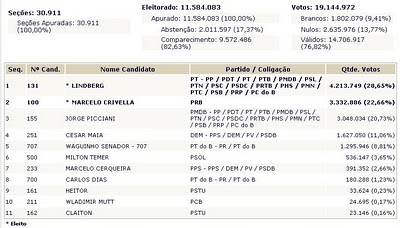 “Lindberg, Renan Calheiros, Edison Lobão, Crivella, Roberto Requião e Marta Suplicy garantem vagas no Senado.