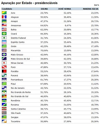 Dilma venceu nos demais estados, mas em alguns deles com uma margem aquém da prevista. Destaco aqui o Rio de Janeiro, onde Marina Silva capturou votos do eleitorado evangélico intimidados com a campanha difamatória feita contra a candidata petista. Ainda não tive acesso aos mapas por região, mas Serra aqui teve a sua votação tradicional, pouco acima dos 20% e bastante concentrada em zonas de maior poder aquisitivo.