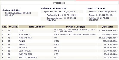 Bom, como se vê pela tabela acima – posicionamento de 23:20 de ontem, domingo – teremos segundo turno na eleição presidencial.