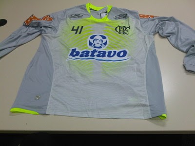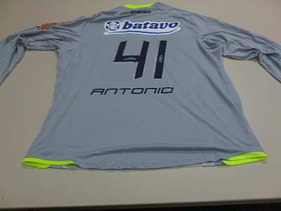 Só que o blog tem uma outra surpresa: sortearemos uma segunda camisa. É um exemplar de treino, cinza, de mangas compridas, bastante raro – não foi vendido em loja. Possui o número 41 e o nome Antonio (volante reserva), está com a etiqueta ainda e é tamanho G como a anterior (abaixo). É uma boa oportunidade de desfilar com um modelo praticamente exclusivo.