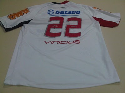 A camisa acima é um exemplar preparado para jogo – embora não tenha chegado a ser utilizada – e é uma parceria do blog com o amigo Sérgio Merçon, que de vez em quando descola umas raridades destas para mim. Ela tem o tamanho G, ligeiramente maior que o vendido em lojas, o número 22 e, obviamente, o nome Vinícius.