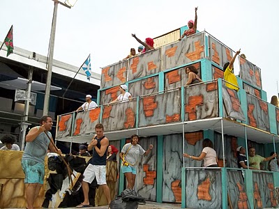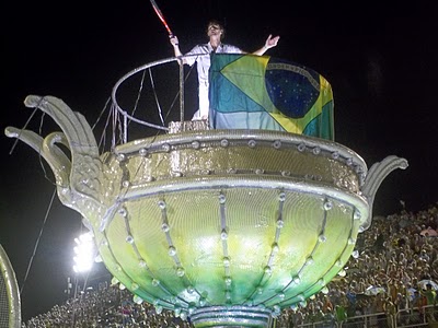 O carro alegórico da favela e a alegria das pessoas mesmo às seis e meia da matina e embaixo de chuva.