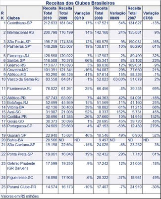 O quadro fica claro quando observamos os dados de receita mundiais. Tomando-se por base a temporada 2009/10, o Aston Villa, vigésimo da lista, auferiu 230 milhões de reais de receita. Primeiro brasileiro, o Corinthians teve 210 milhões de reais, apesar do câmbio apreciado estar nos favorecendo neste caso.