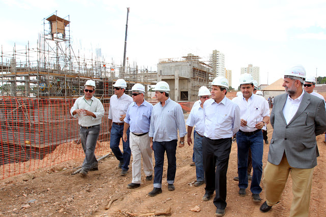 Segundo o Comitê Organizador, a Arena Pantanal (obra acima, em visita do ex-governador do estado e atual senador Blairo Maggi), que está sendo construída para abrigar os jogos da Copa 2014 tem influência inglesa adaptada para o clima local e é flexível para multiuso. Está localizada no bairro Verdão, a aproximadamente quatro quilômetros do centro de Cuiabá. Contará com restaurantes, hotéis, estacionamentos, lagos, bosque e pista para caminhada.