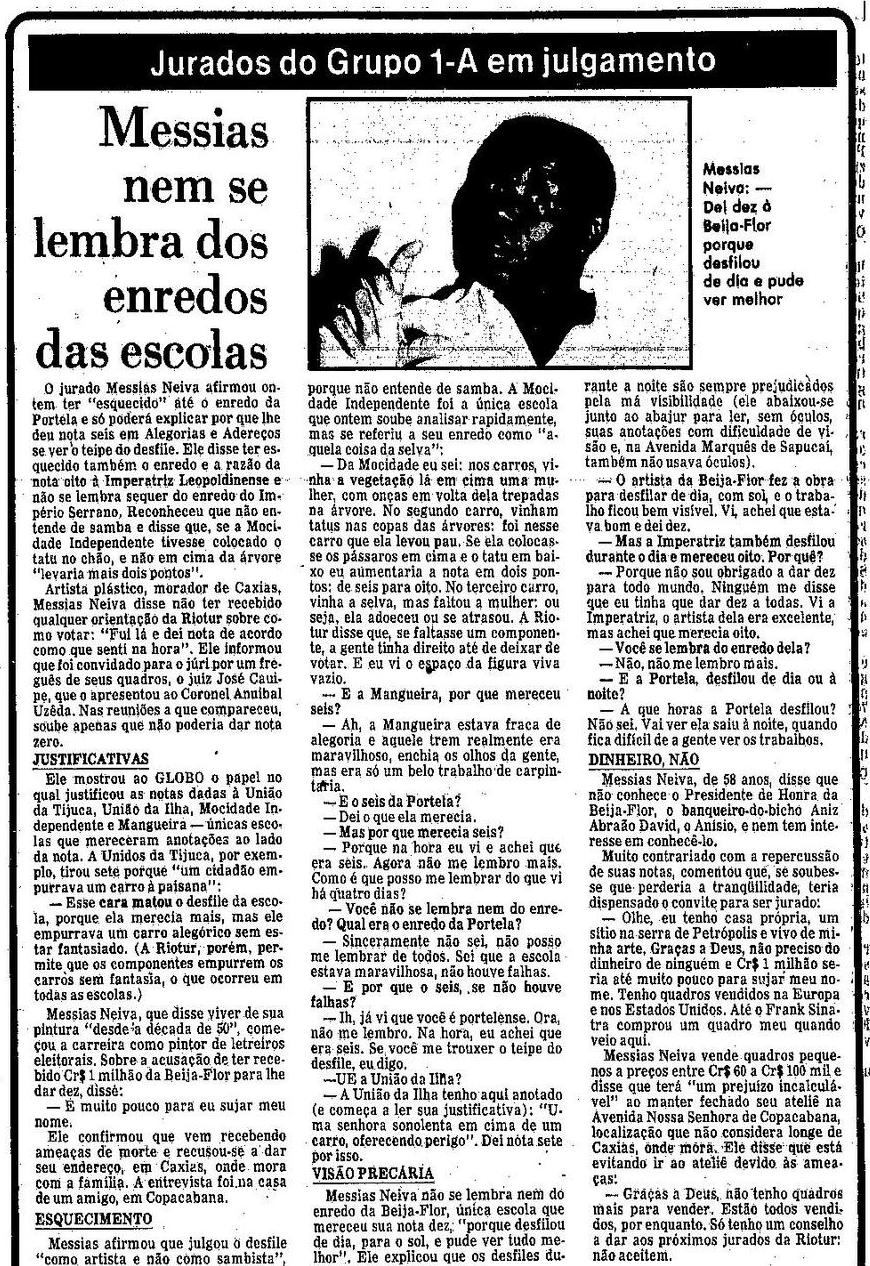 Quanto a Messias Neiva, o jornal “O Globo” conseguiu entrevistá-lo no dia seguinte à apuração (imagem acima) – o Migão também transcreveu na íntegra a entrevista no “Samba de Terça” sobre o desfile da Beija-Flor em 1983.