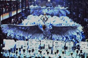 A veia crítica do enredo se mostrou clara no setor “Deu a louca no Xingu”, no qual era evidenciada a influência do homem moderno, com índios usando patins, guiando bicicletas e exibindo placas de trânsito. Genial! Como bem apontava o enredo, a Mãe Natureza se revoltou contra essa invasão do homem, o que foi muito bem simbolizado numa alegoria com a Ave Dourada Malfazeja, que soltava fumaça e tinha como destaque Marlene Paiva (foto abaixo).