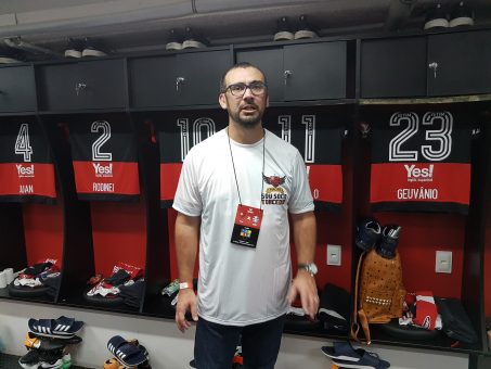 Cada jogador tem sua “baia” com o material de jogo. Camisas (primeiro e segundo tempo), calção, roupa térmica, chuteiras (três ou quatro pares para cada jogador), chinelos e um par de tênis. Por algum motivo que não saberia explicar, na baia do jogador Pará havia uma camisa do Grêmio personalizada, ele que é ex-jogador da equipe.
