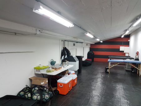 Este é bem pequeno, como podem ver no vídeo acima. Imaginar 22 jogadores se trocando ao mesmo tempo naquele espaço de uns 30 metros quadrados deve ser algo bem confuso. Na outra sala ficam os uniformes da Comissão Técnica, as bolas e demais apetrechos necessários ao trabalho de aquecimento (feito no campo de jogo), as mesas de fisioterapia/cuidados médicos e uma mesa com salada de frutas e garrafas térmicas – acredito que de suco, leite e café.