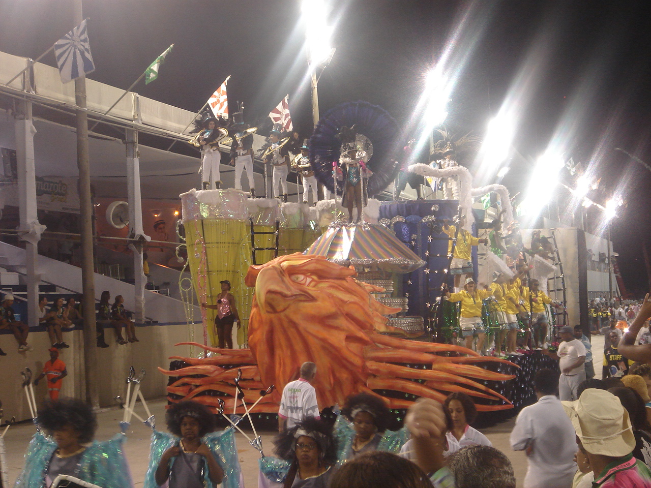 A reciclagem de esculturas é algo que já se tornou algo tradicional nestes grupos. Um bom exemplo é a águia de 2008 da Portela, que perdeu o neon original e foi repintada para desfilar pela Lins Imperial naquela oportunidade (abaixo).