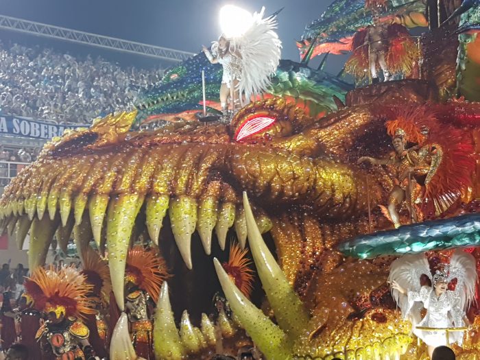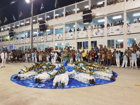– Falando em Imperatriz, como torcedor Gresilense, considero este o melhor desfile da “era Cahê Rodrigues”, durante a qual a Escola desperdiçou algumas oportunidades de título por inconsistências de enredo que refletiam na plástica dos desfiles. A exceção fica para o último carro, lindo em fotos e até mesmo pela televisão, mas ao vivo deixava a desejar em mais um clássico problema com estruturas tubulares aparentes: tem que saber fazer… No mais, acredito que o bom resultado visual tenha sido a presença massiva de profissionais de Parintins no barracão da Escola. Alguns itens do Festival desfilaram, como a então Rainha do Folclore do Boi Caprichoso, Brenna Dianá, destaque da alegoria 2 “O encanto da floresta”, com um gigantesco jacaré de mais de 30 m de comprimento. O jacaré, como muitas esculturas marcantes no carnaval, segue carreira nas divisões menores…