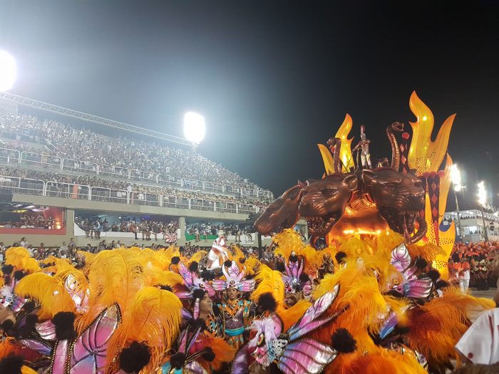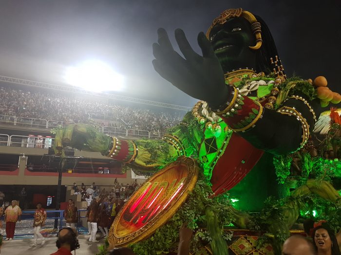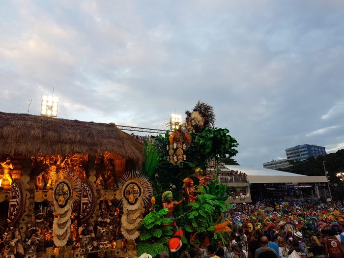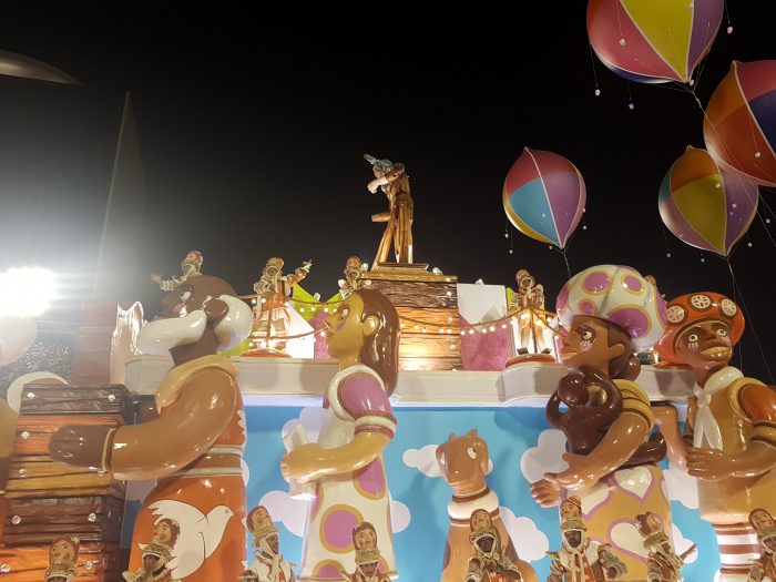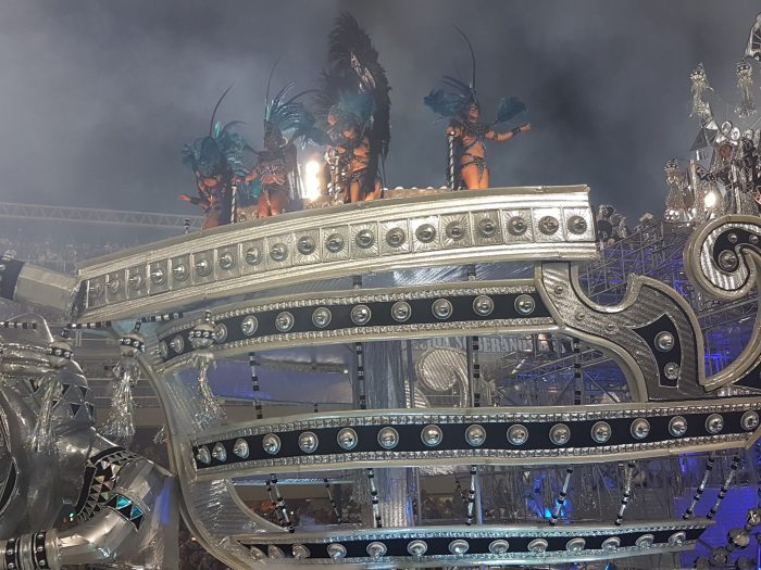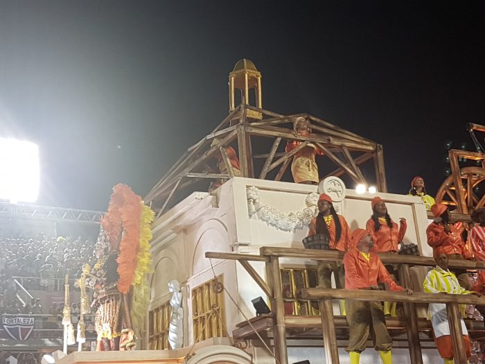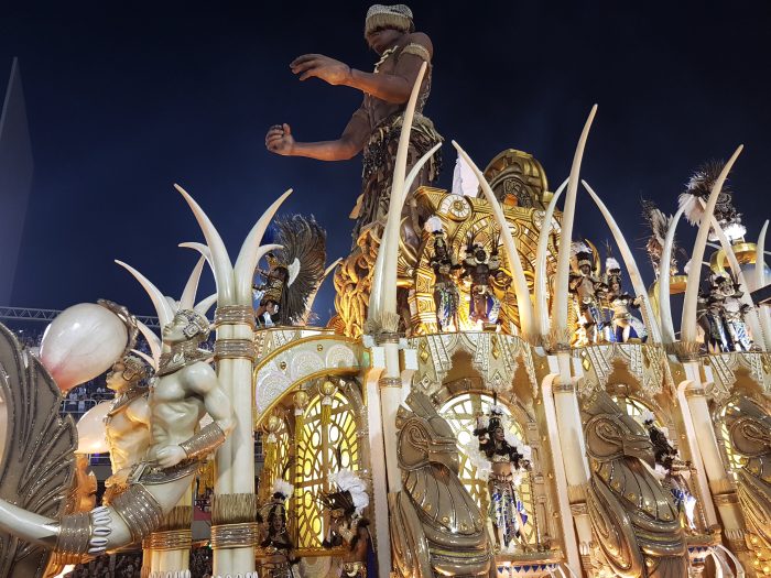 Infelizmente, o quinto carro alegórico, chamado “O Fogo de Uiangongo”, teve problemas para ser manobrado durante toda a avenida devido a um problema na caixa de marchas. Logo na entrada na Sapucaí, a ala à frente se adiantou demais, e a evolução teve buracos (abaixo), o que comprometeu a até então ótima apresentação da Ilha.